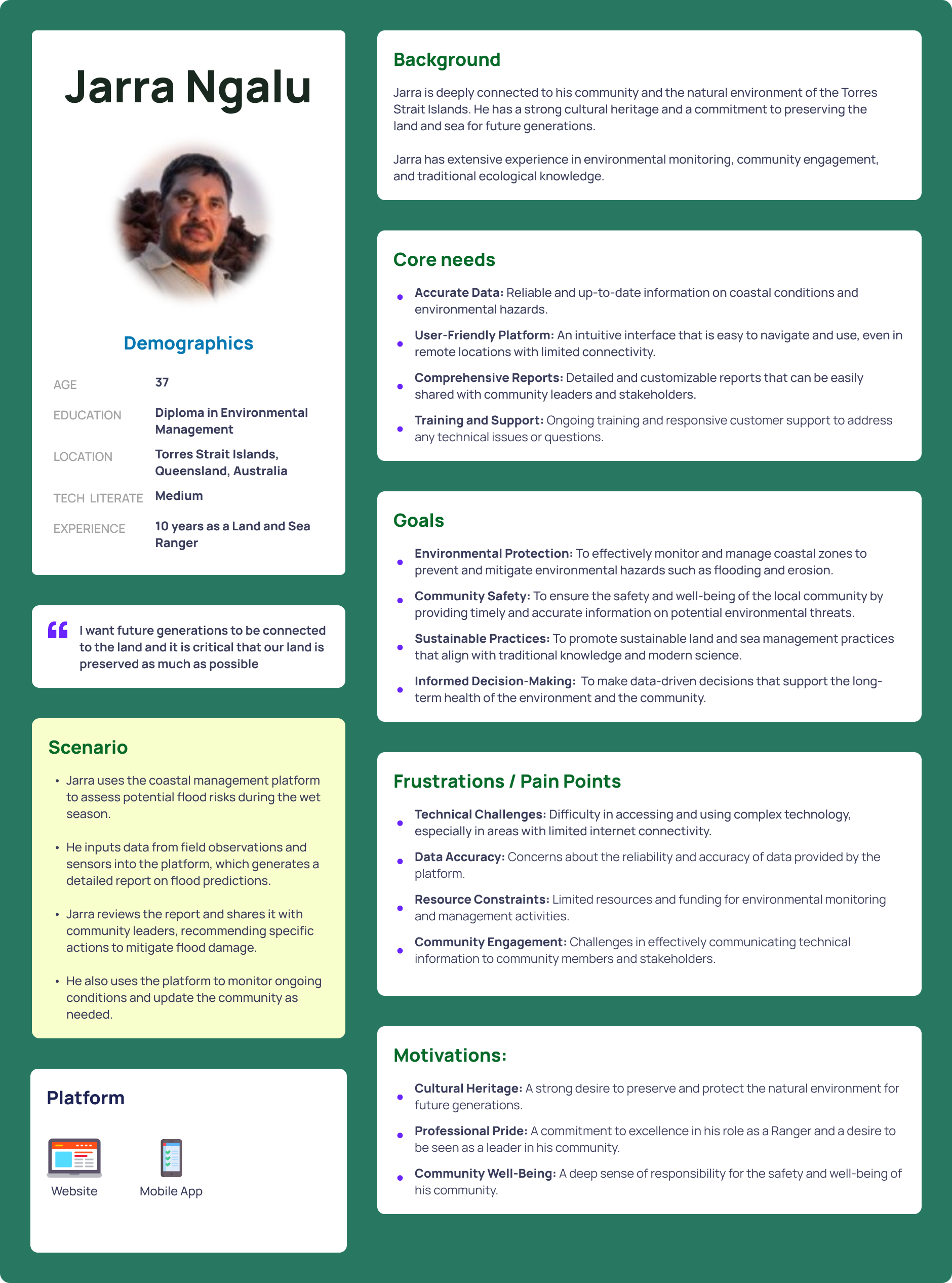 Local land and sea custodial rangers of Torres Strait Island were concerned about the changes in their environment such as coastal erosion and pollution. They lacked the GIS tools to clearly track changes in the land over time. Product research showed that most GIS tools are designed for geologists or IT experts. They also don’t have the ability to track and document evidence of past , present and future coastal changes.